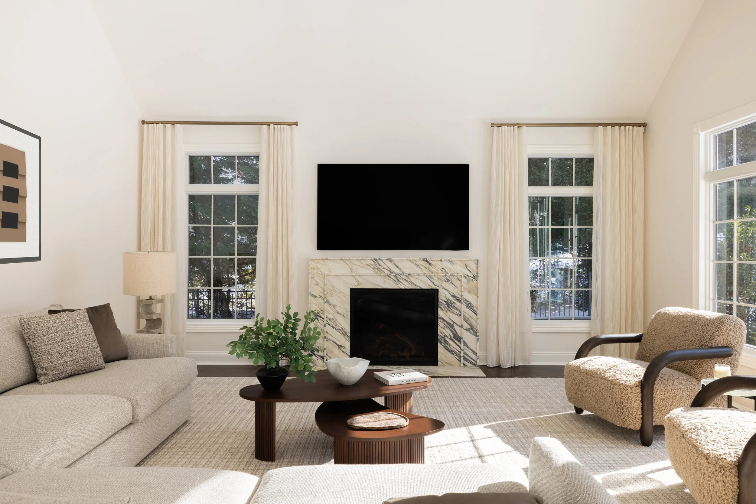 Designed for a growing family, this project completes a nearly finished home with a thoughtfully furnished living room and serene primary bedroom, unified by a simple, modern, neutral aesthetic. Clean lines, soft textures, and intentional details create a calm, functional space that feels both elevated and welcoming.