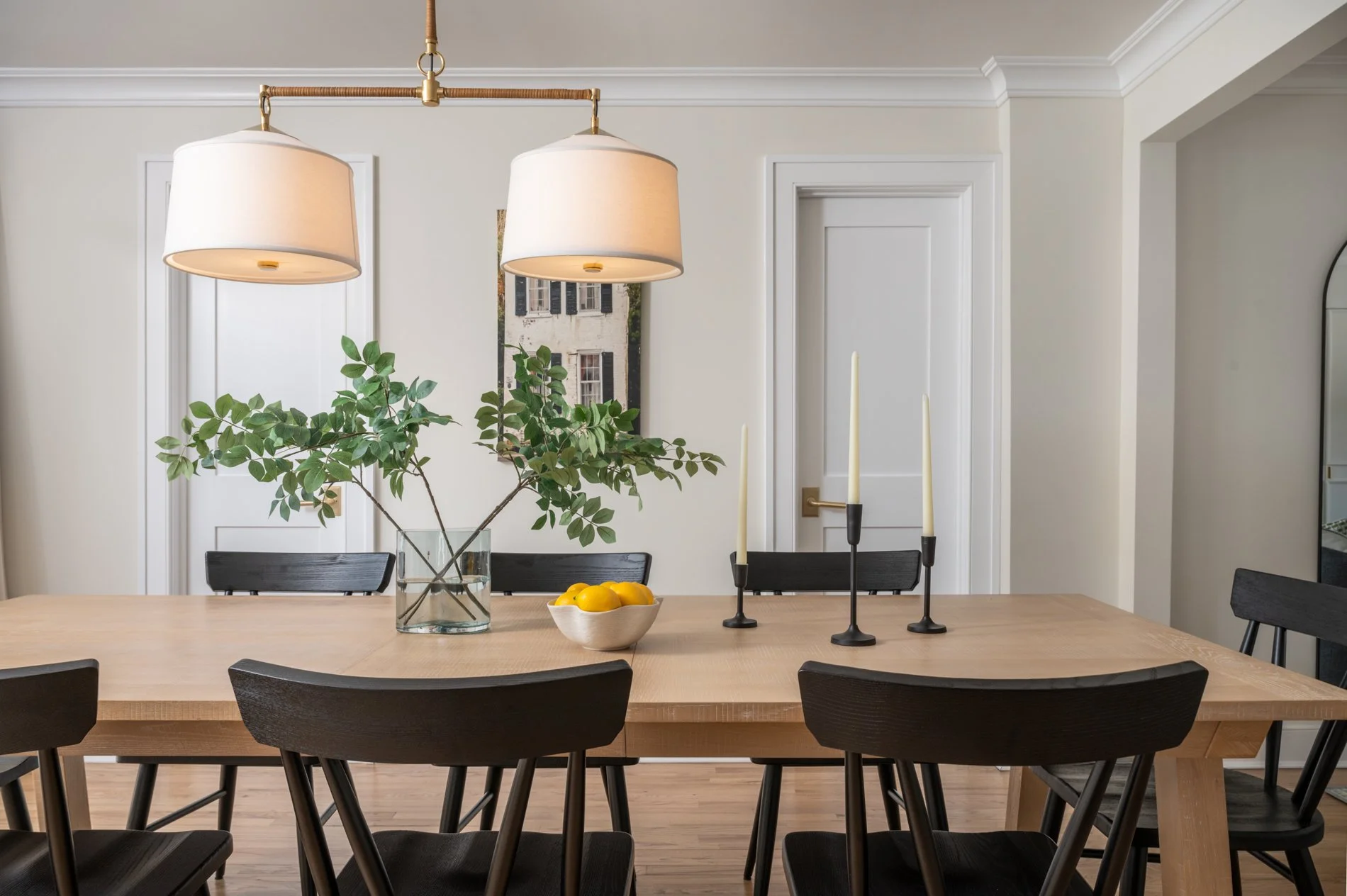 A dining room with a rectangular wooden table, six black chairs, a glass vase with green leafy branches, a bowl of yellow lemons, and three tall black candle holders with white candles. Two white pendant lights hang above the table. There's a painting of a building on the wall behind the table. White walls and a closed door are visible.